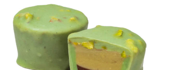 White chocolate with matcha, caramel and pistachio cream